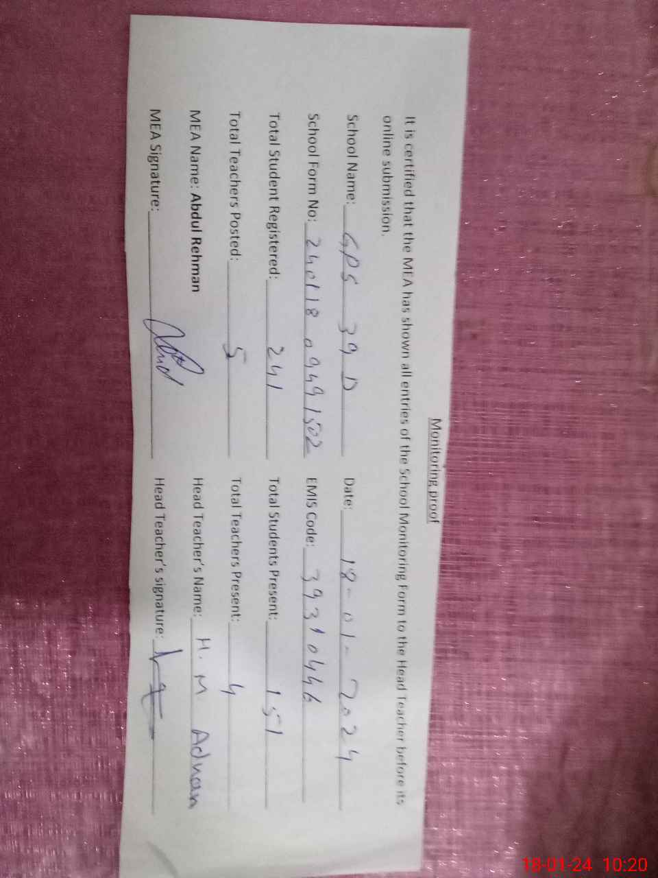 | Attendance Register | Head Teacher | MEA with School | Visit Proof |