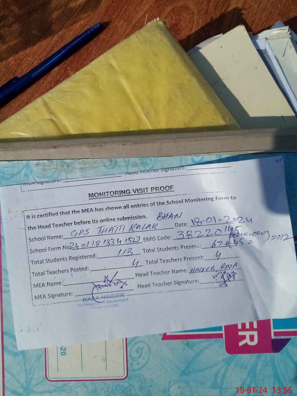 | Attendance Register | Head Teacher | MEA with School | Visit Proof |