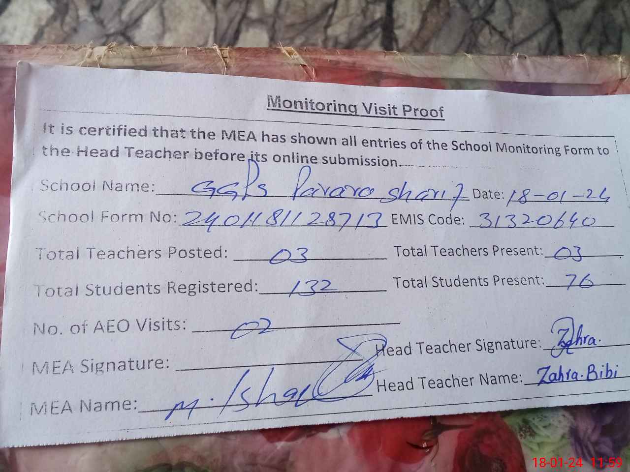 | Attendance Register | Head Teacher | MEA with School | Visit Proof |