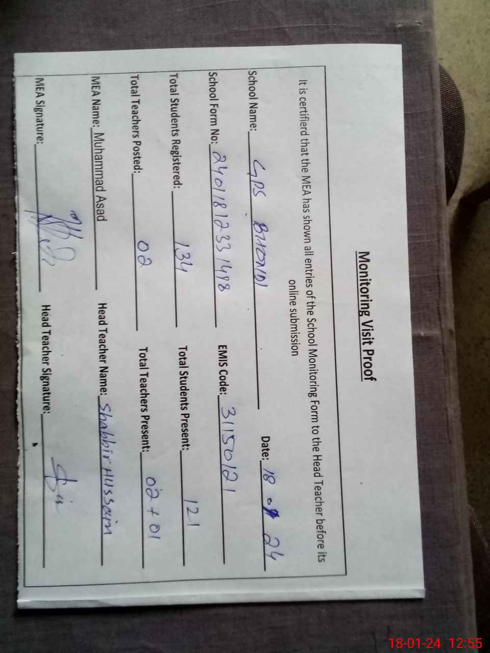 | Attendance Register | Head Teacher | MEA with School | Visit Proof |