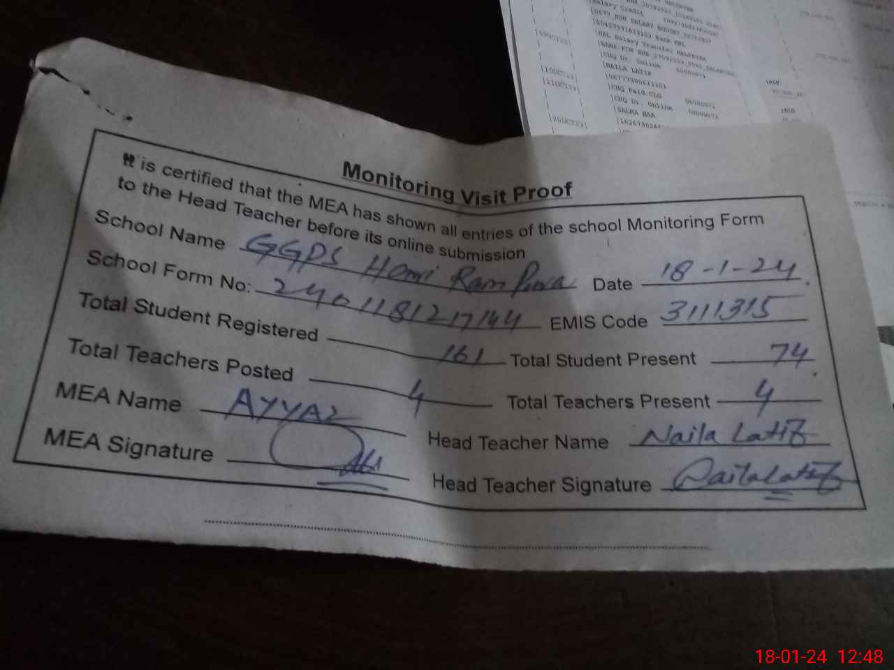 | Attendance Register | Head Teacher | MEA with School | Visit Proof |