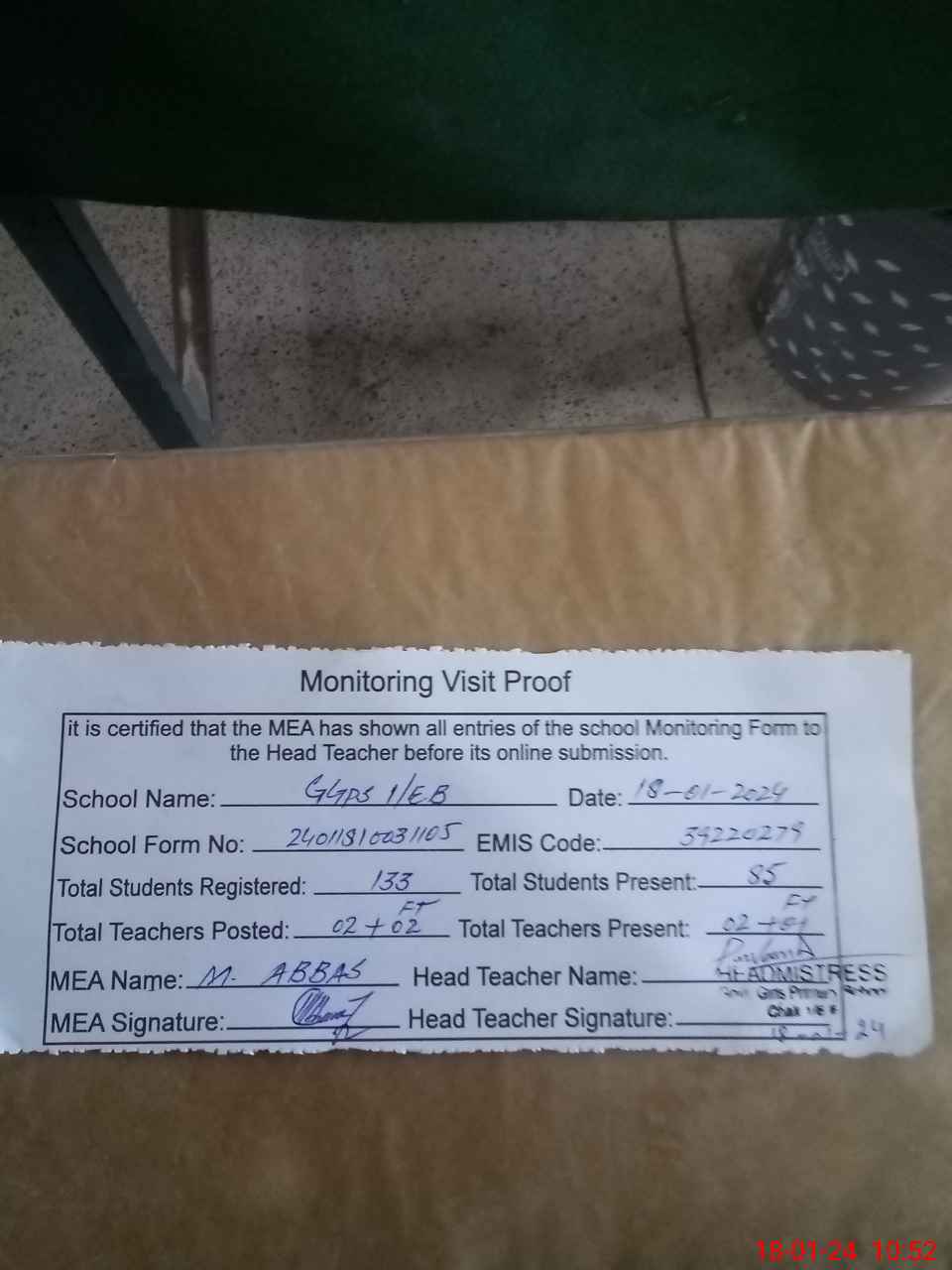 | Attendance Register | Head Teacher | MEA with School | Visit Proof |