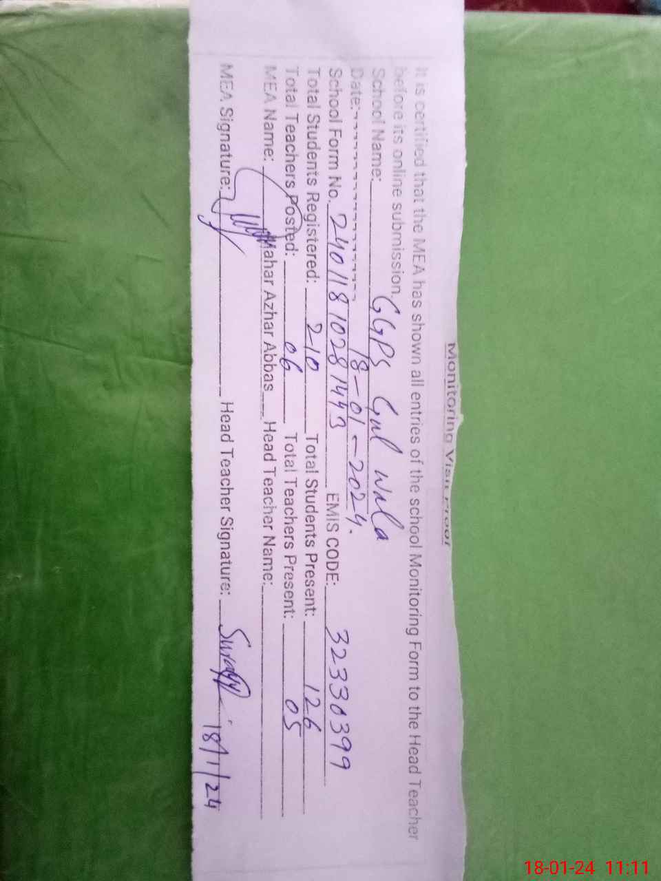 | EMIS Code: 32330399 | Name of School: GGPS GULL WALA | |||