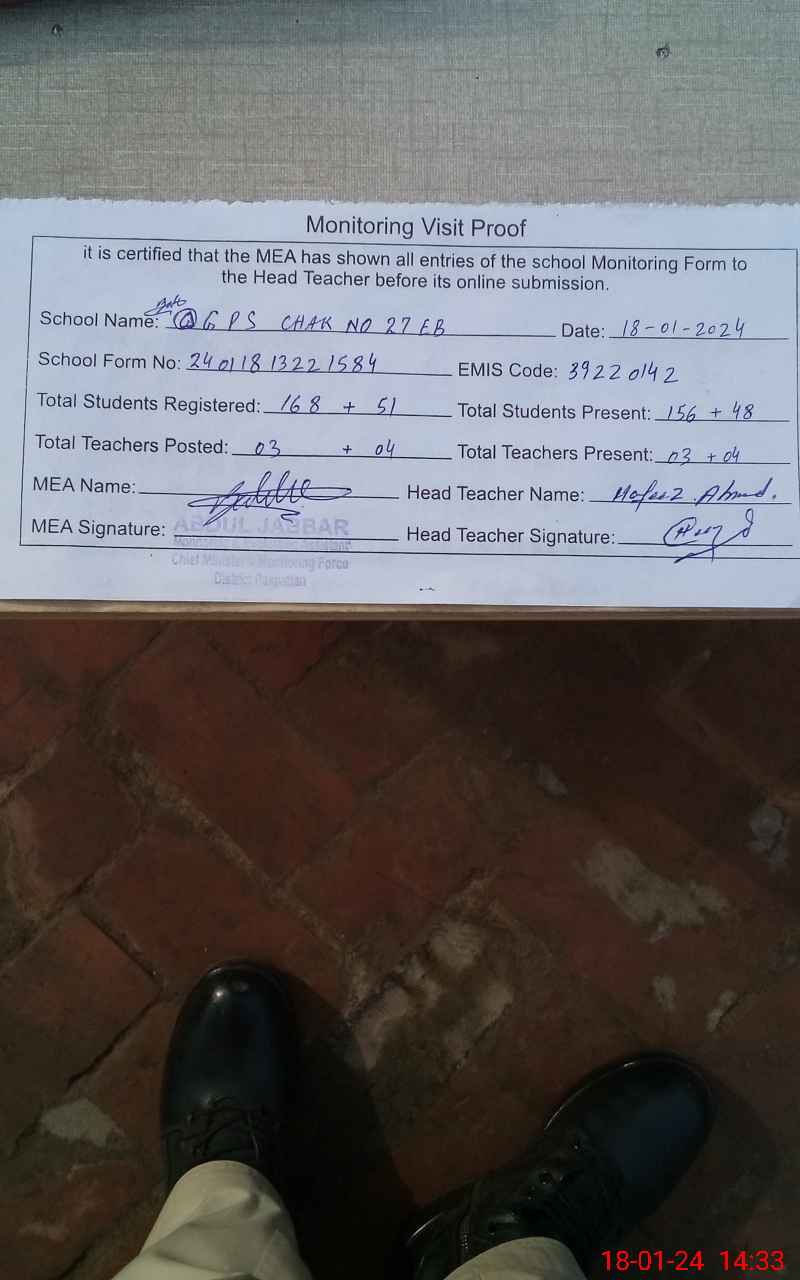 | EMIS Code: 39220142 | Name of School: GPS CHAK NO. 27 EB | |||