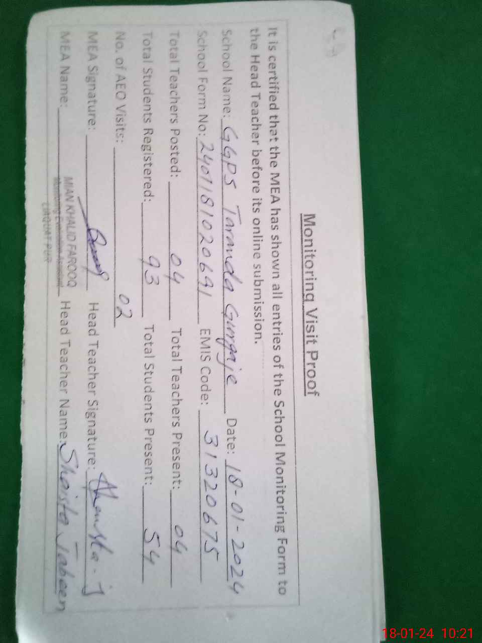 | Attendance Register | Head Teacher | MEA with School | Visit Proof |