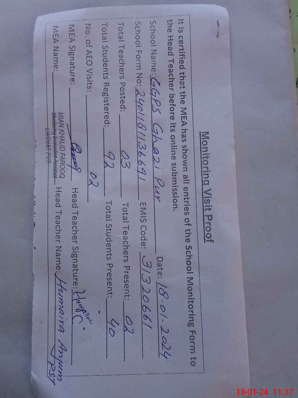 | Attendance Register | Head Teacher | MEA with School | Visit Proof |