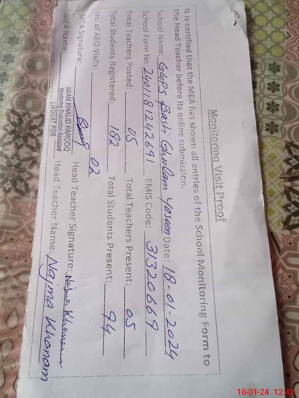 | Attendance Register | Head Teacher | MEA with School | Visit Proof |