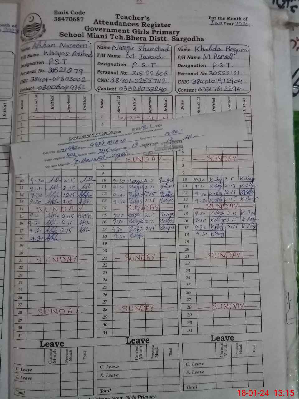 | District: SARGODHA | Tehsil: BHERA | Markaz: MIANI - FEMALE | Level: Primary | |