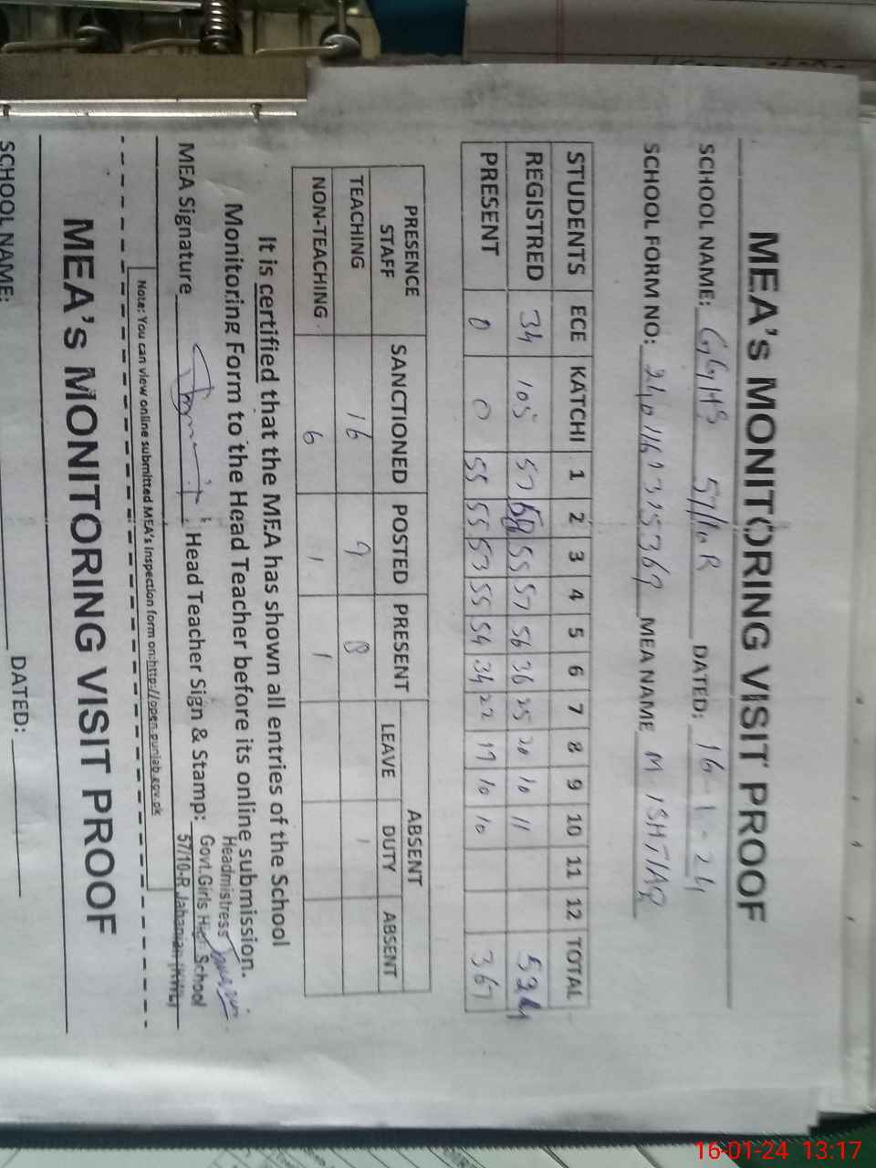 | Attendance Register | Head Teacher | MEA with School | Visit Proof |