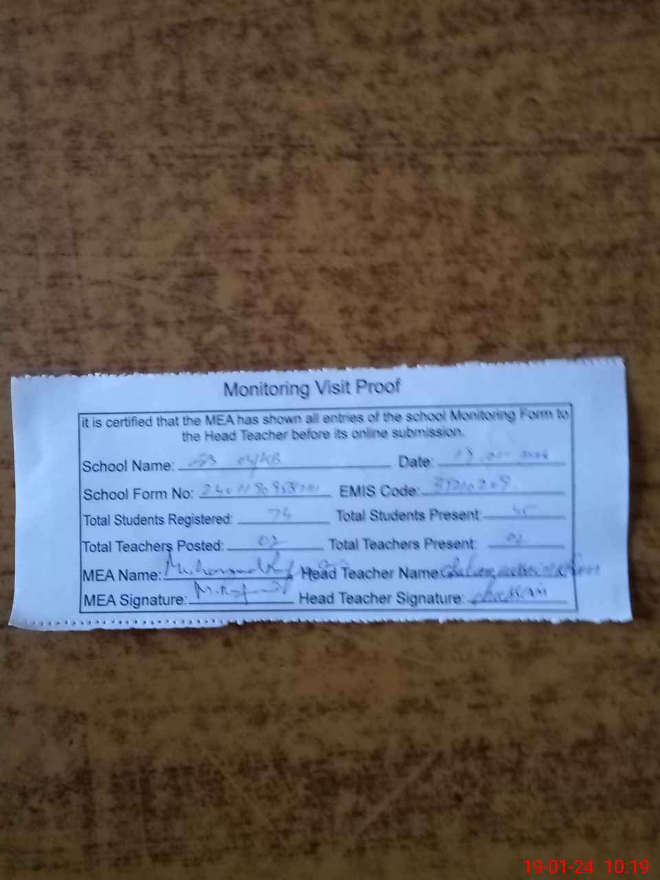| Attendance Register | Head Teacher | MEA with School | Visit Proof |