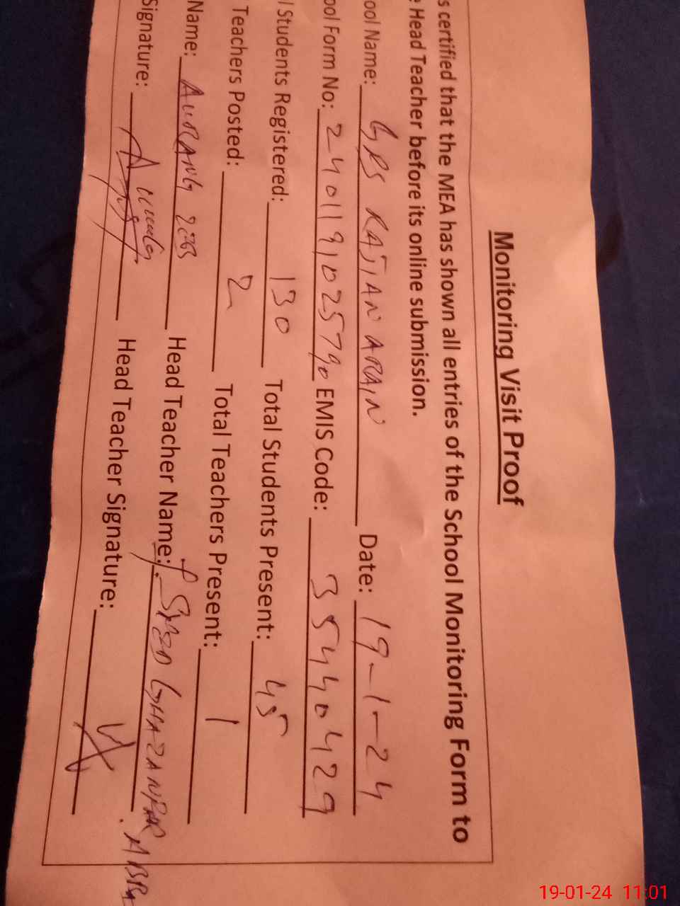 | Attendance Register | Head Teacher | MEA with School | Visit Proof |