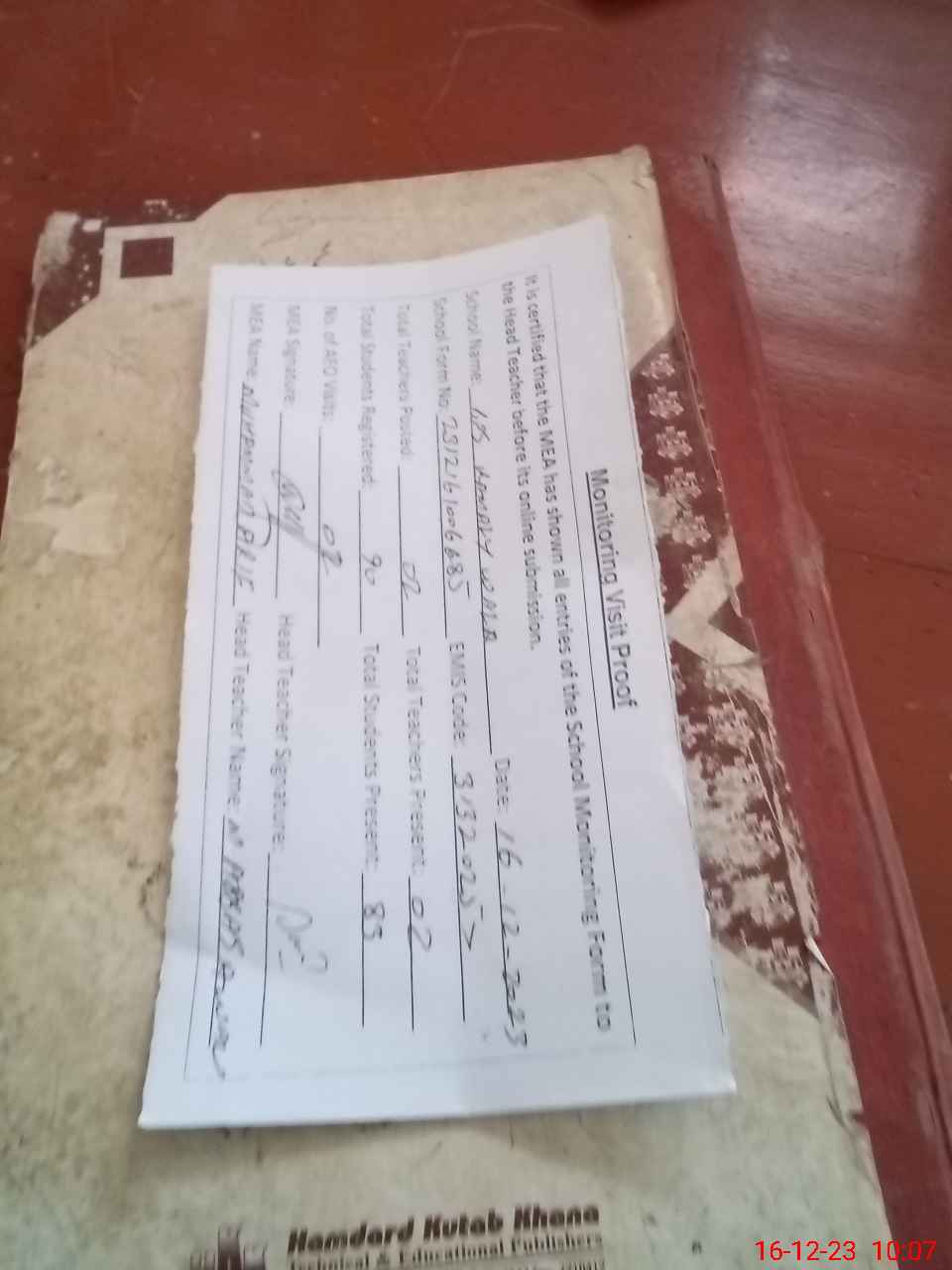 | Attendance Register | Head Teacher | MEA with School | Visit Proof |