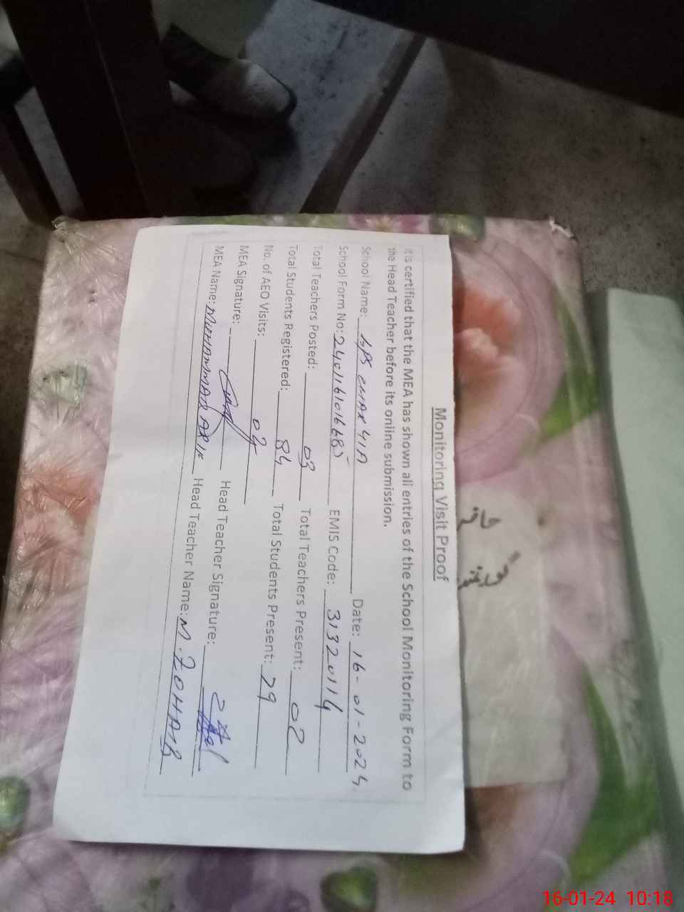 | Attendance Register | Head Teacher | MEA with School | Visit Proof |