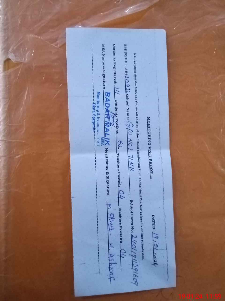 | Attendance Register | Head Teacher | MEA with School | Visit Proof |