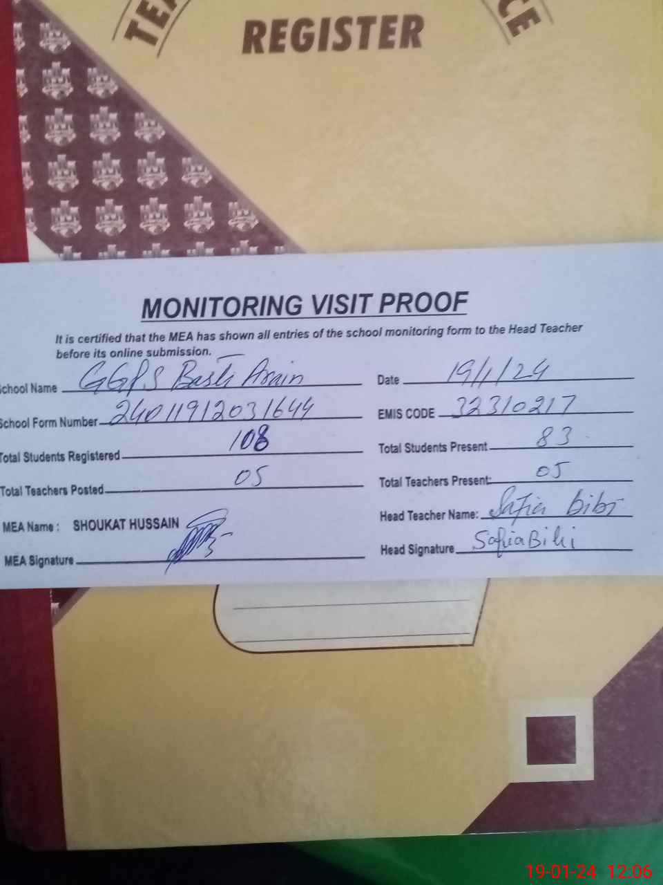 | Attendance Register | Head Teacher | MEA with School | Visit Proof |