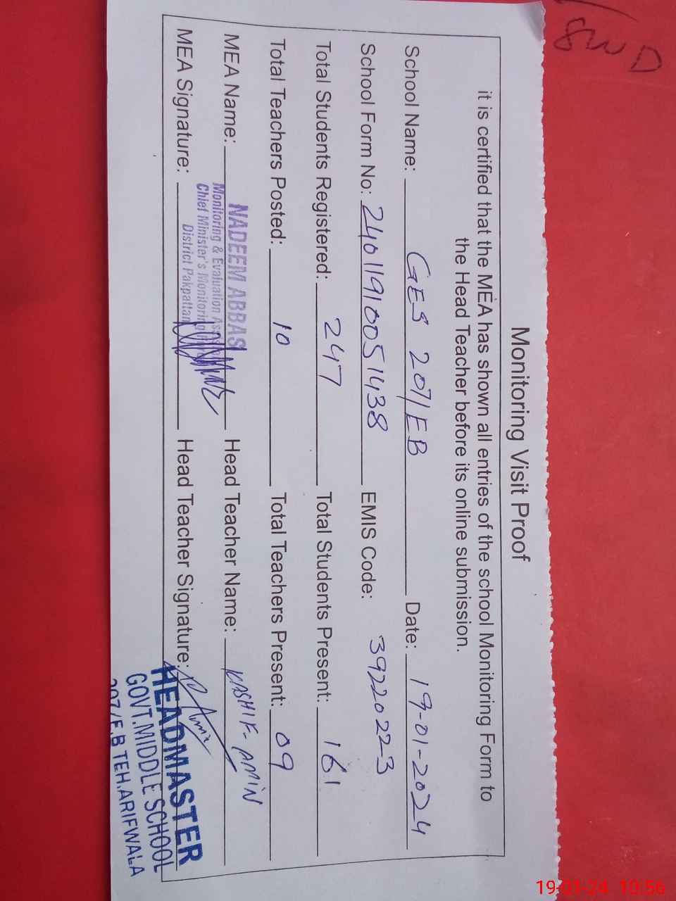 | EMIS Code: 39220223 | Name of School: GES CHAK NO. 207 EB P.O SAME ARIF WALA | |||