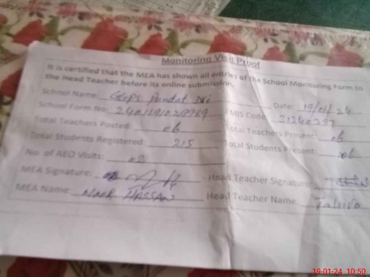 | Attendance Register | Head Teacher | MEA with School | Visit Proof |