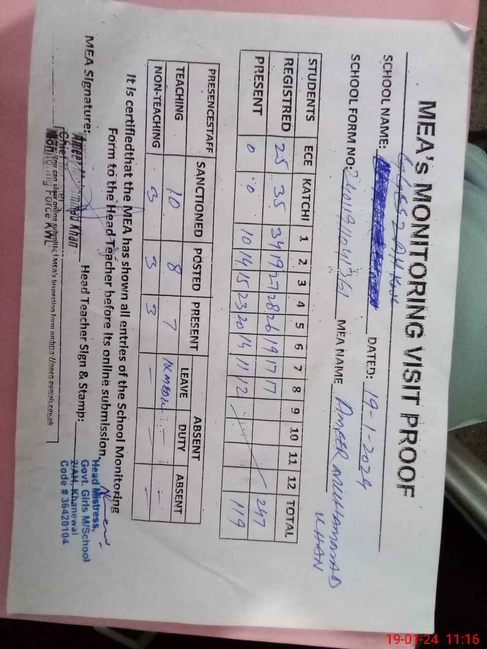 | Certified that this School was Inspected by the Undersigned MEA/DMO Today and the Information Stated Above is as Per Record. | |||||