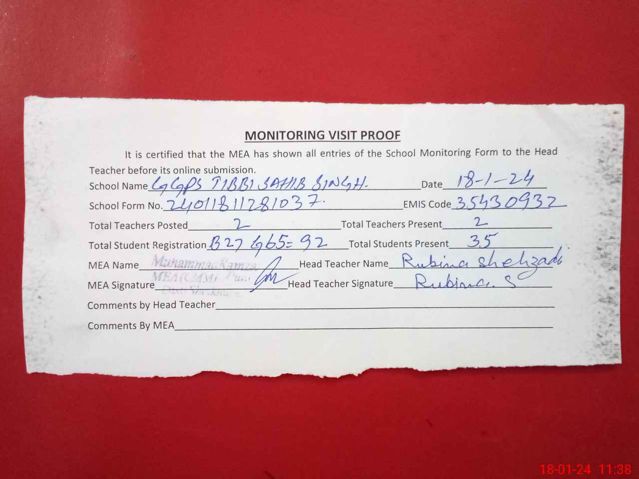 | Attendance Register | Head Teacher | MEA with School | Visit Proof |