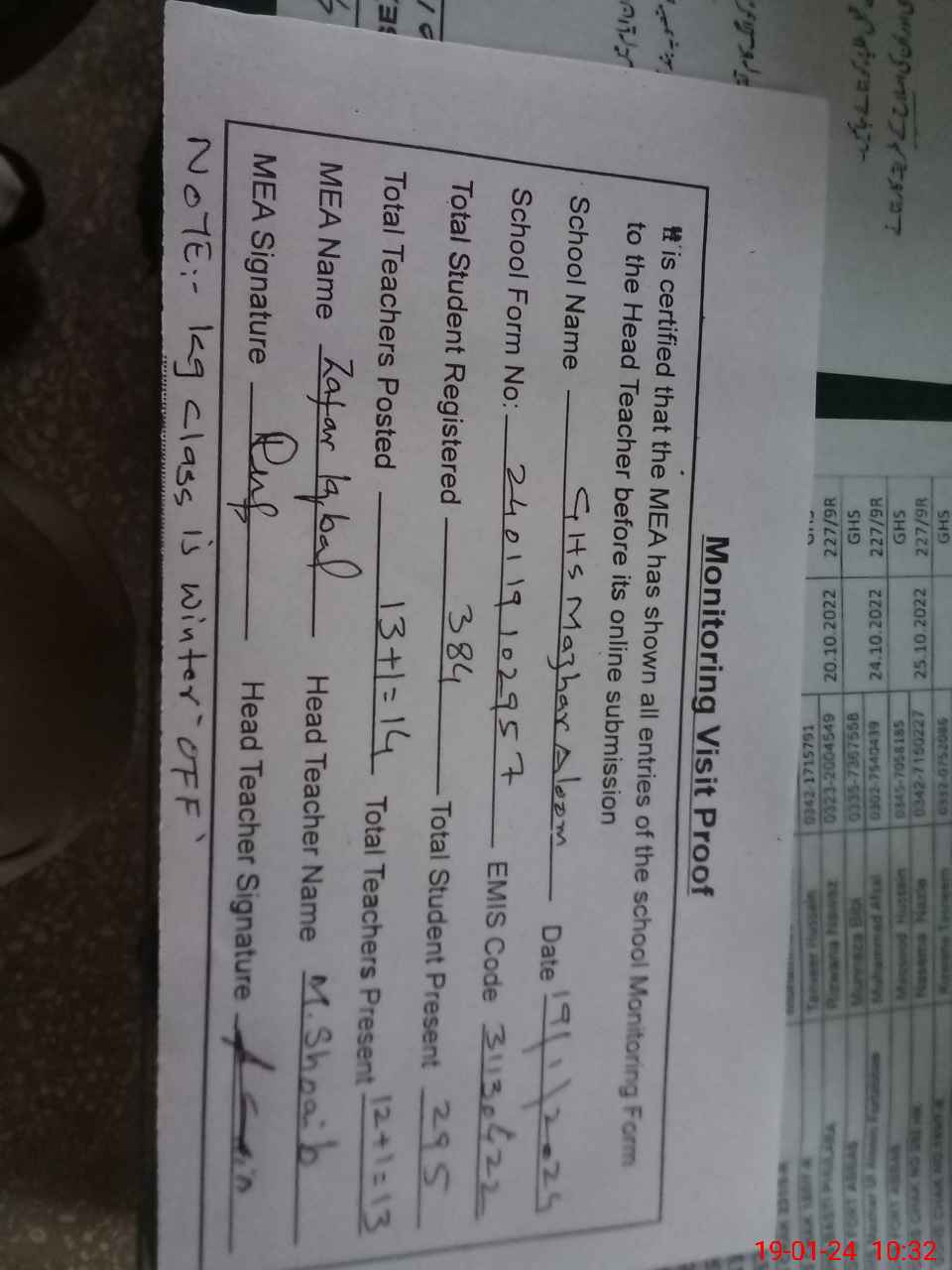 | Attendance Register | Head Teacher | MEA with School | Visit Proof |