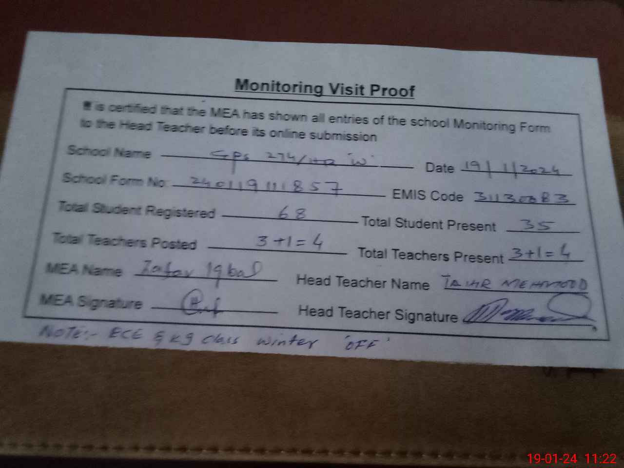 | Attendance Register | Head Teacher | MEA with School | Visit Proof |