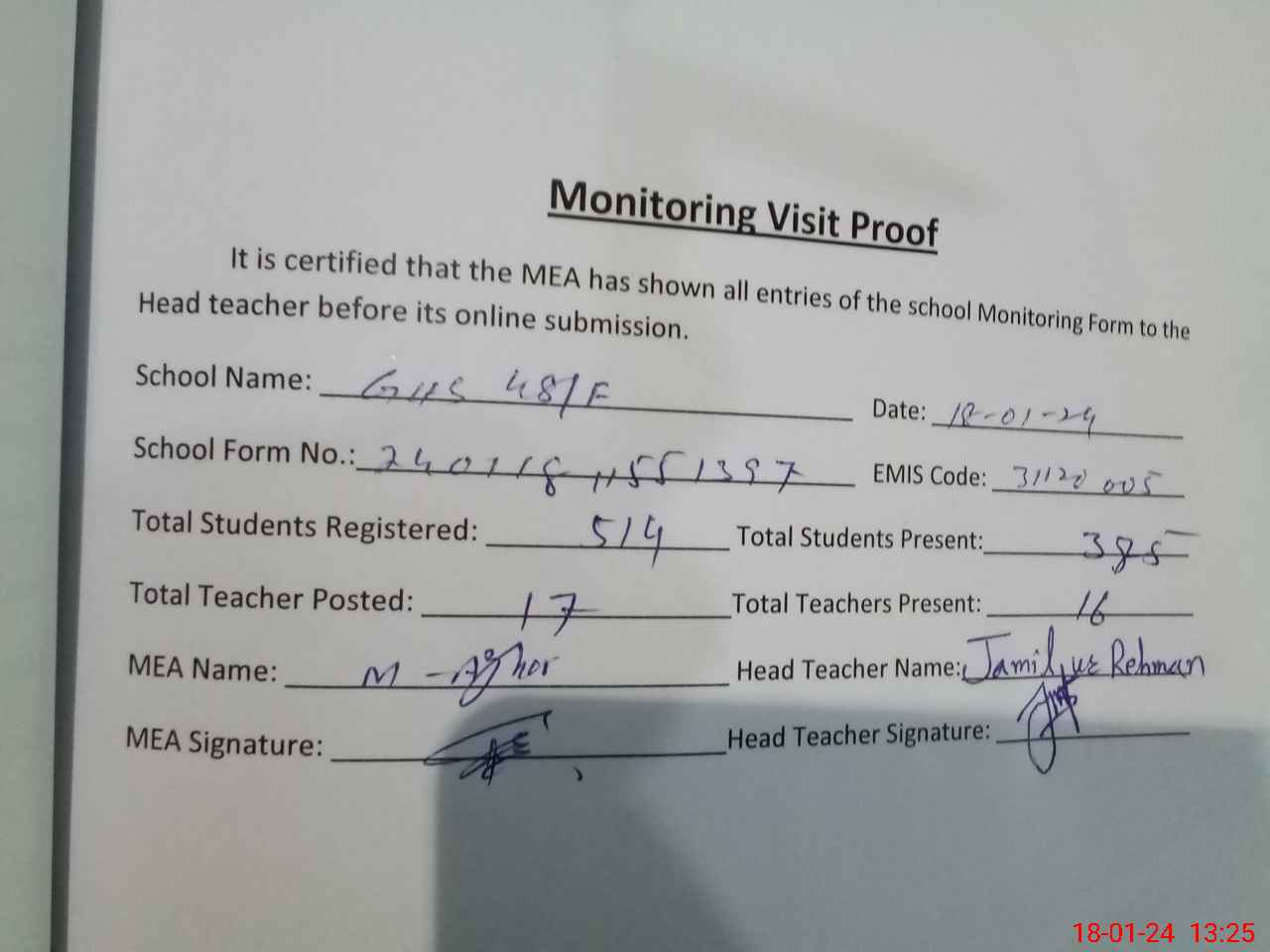| EMIS Code: 31120005 | Name of School: GHS CHAK NO. 48/F | |||