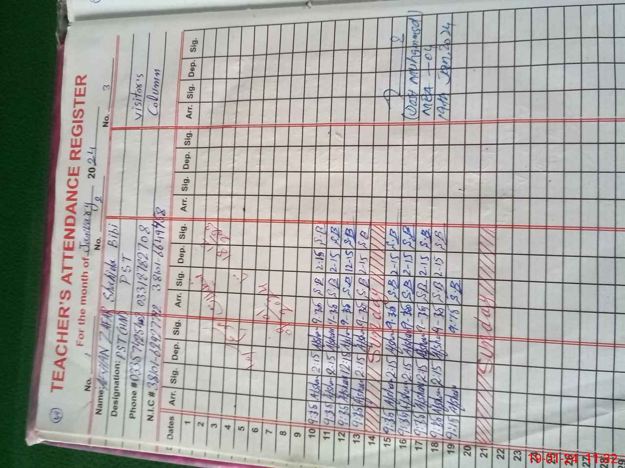 | CNIC | Full Name | Designation | R/C | Absence During Last Calender Month |