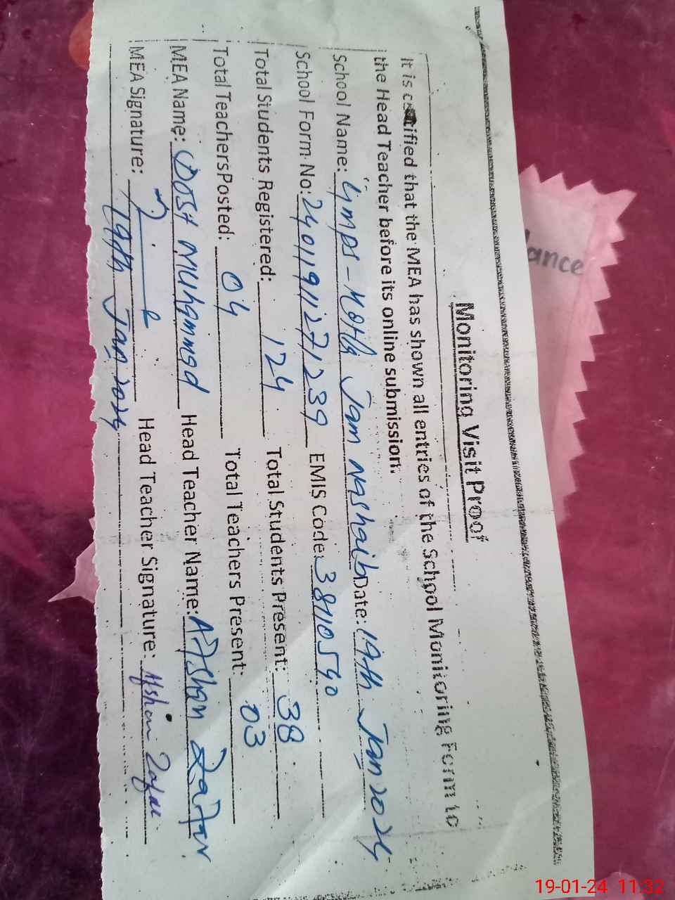 | Attendance Register | Head Teacher | MEA with School | Visit Proof |
