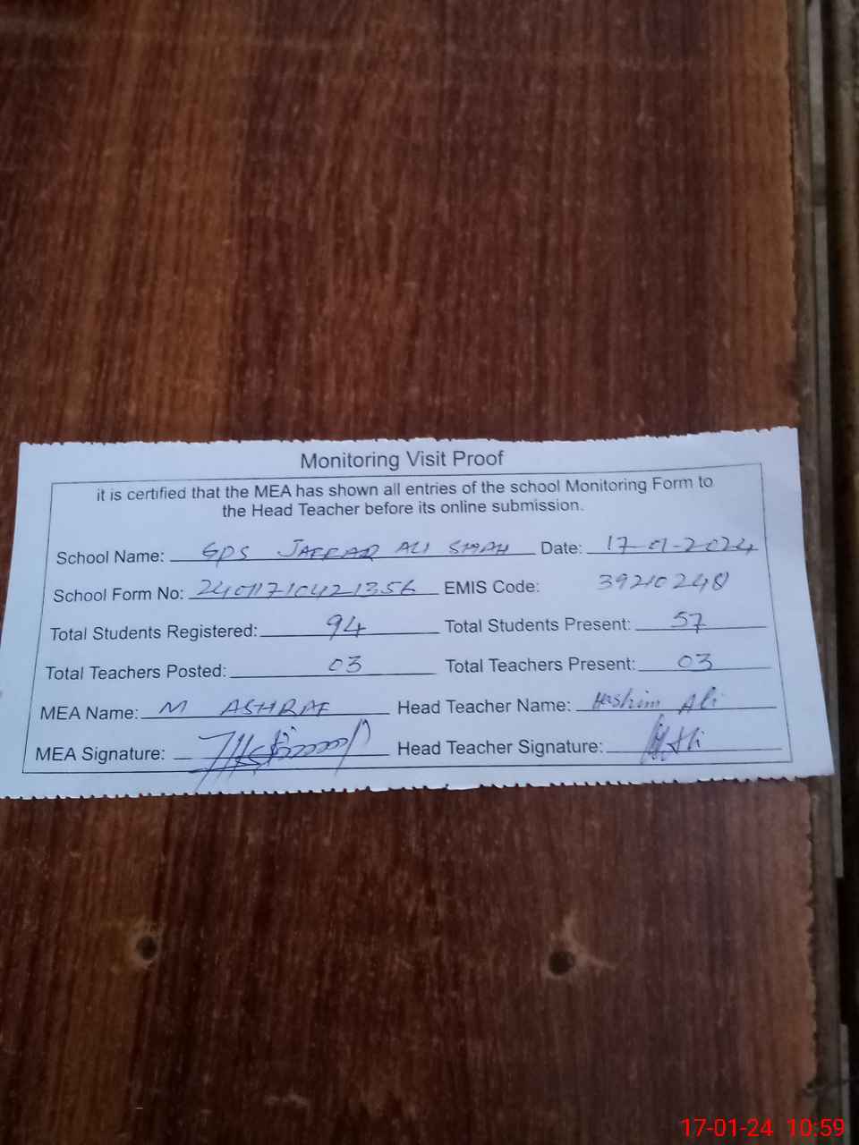 | Attendance Register | Head Teacher | MEA with School | Visit Proof |