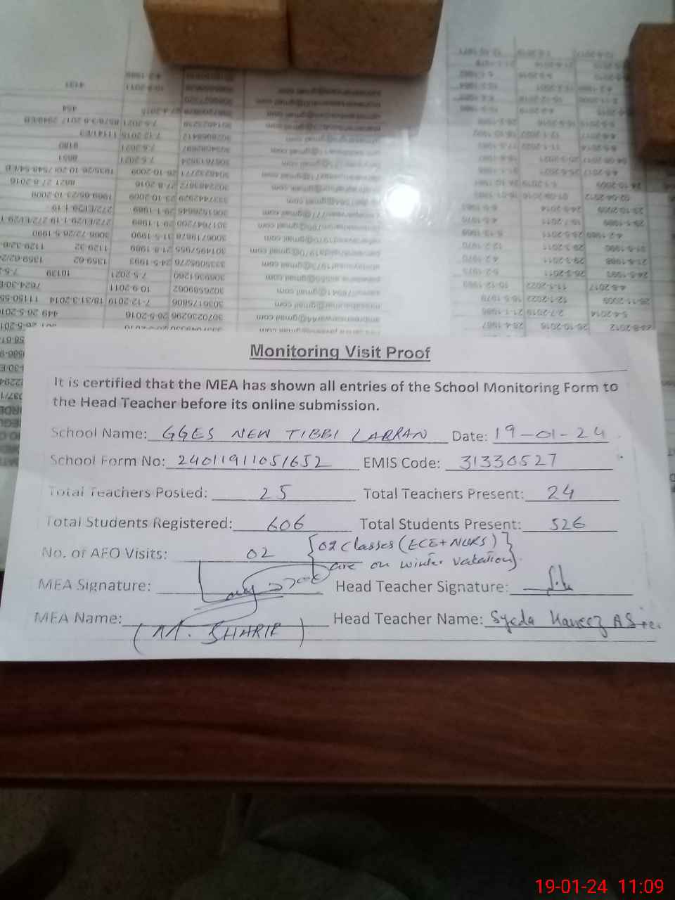 | Attendance Register | Head Teacher | MEA with School | Visit Proof |
