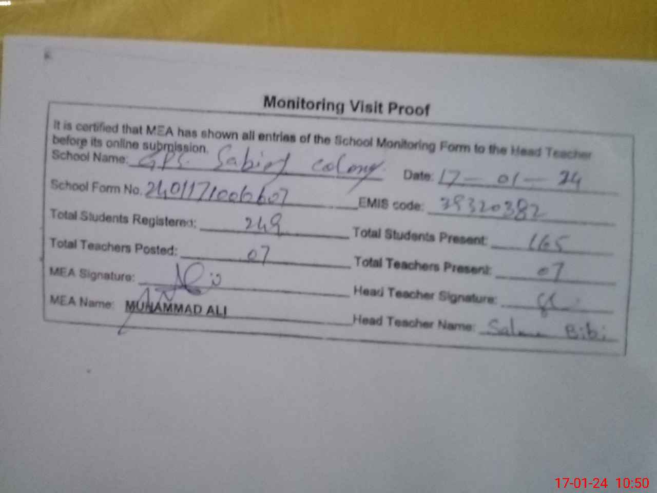 | Attendance Register | Head Teacher | MEA with School | Visit Proof |