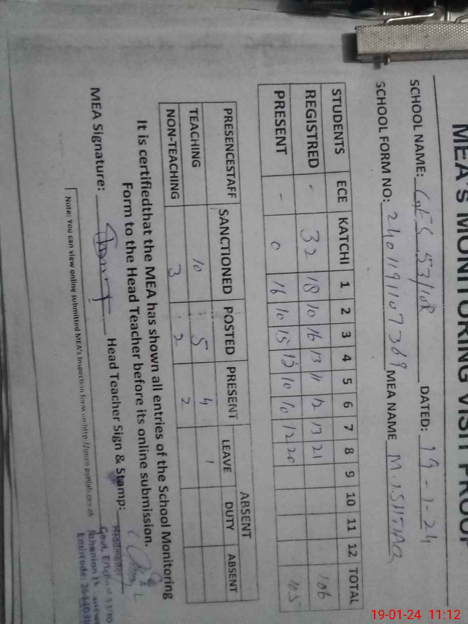 | Certified that this School was Inspected by the Undersigned MEA/DMO Today and the Information Stated Above is as Per Record. | |||||