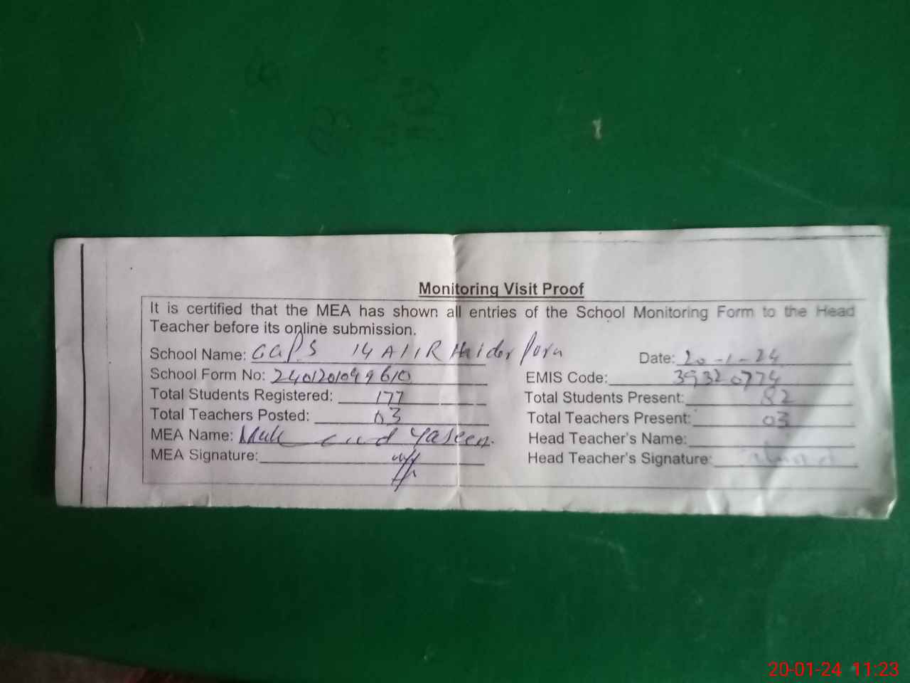 | Attendance Register | Head Teacher | MEA with School | Visit Proof |