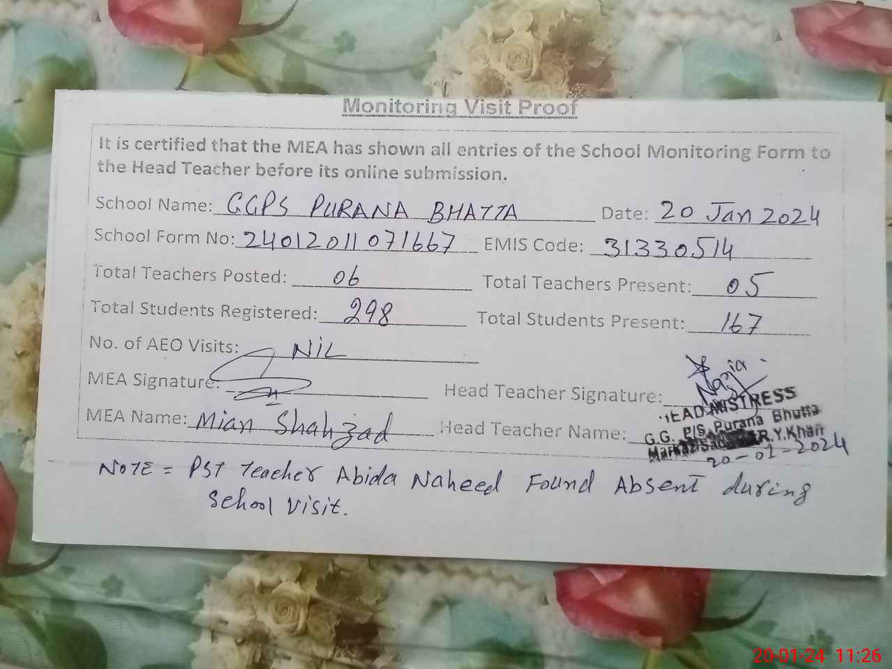 | Remarks (Use Separate Page if Required): PST teacher Abida Naheed found absent during visit | |||||