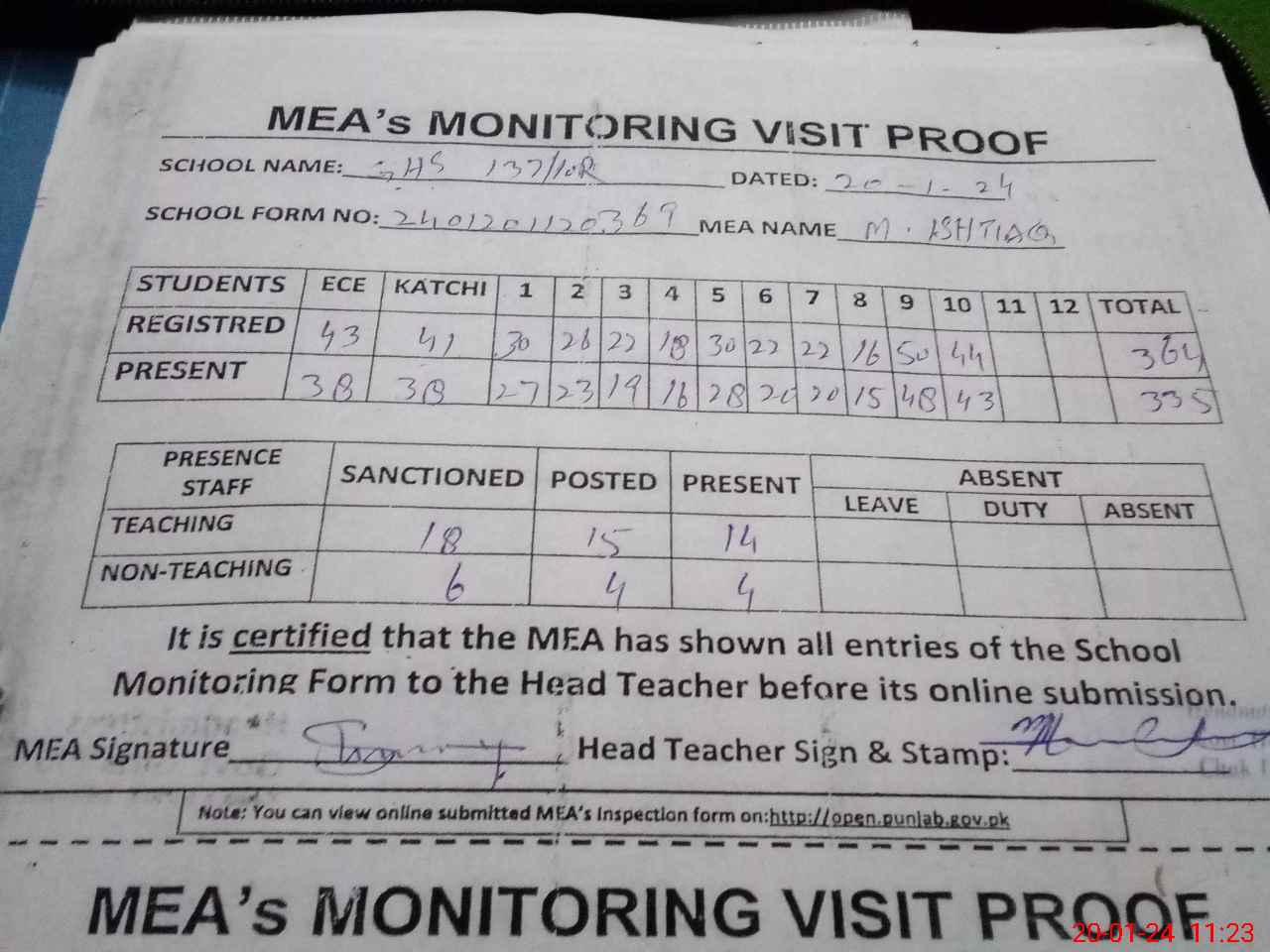 | Attendance Register | Head Teacher | MEA with School | Visit Proof |