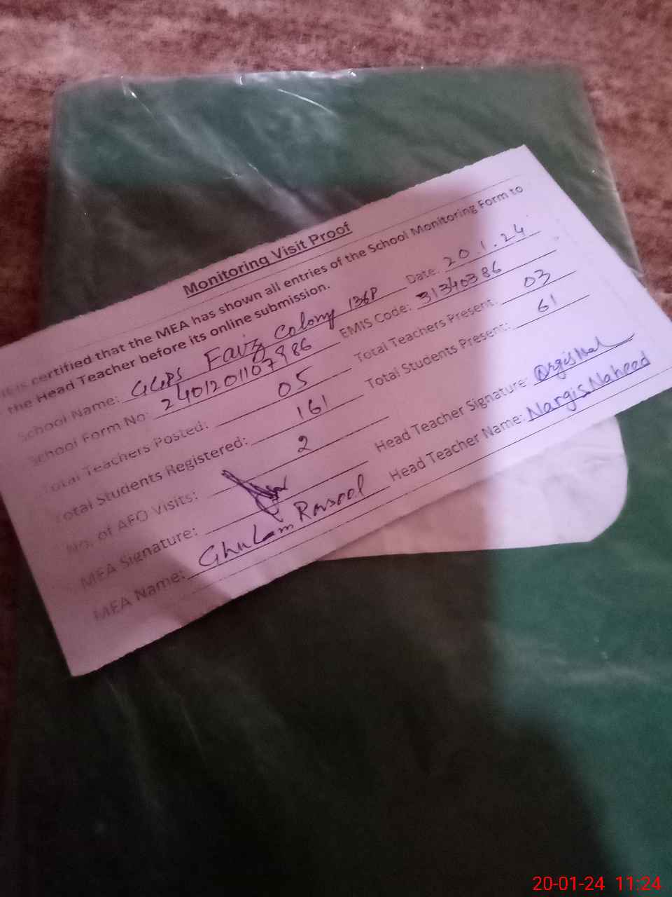 | Total no. of Classrooms: 1 No. of Classrooms Used for Teaching: 1 No. of Classrooms Storing Old Furniture, FTBs, etc: 0Comments if Any: The school is running in a rented house Cash book is not shown SIS is not maintained Leave of the teacher Farhat Naz is not approved |