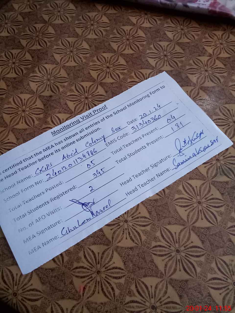 | Attendance Register | Head Teacher | MEA with School | Visit Proof |
