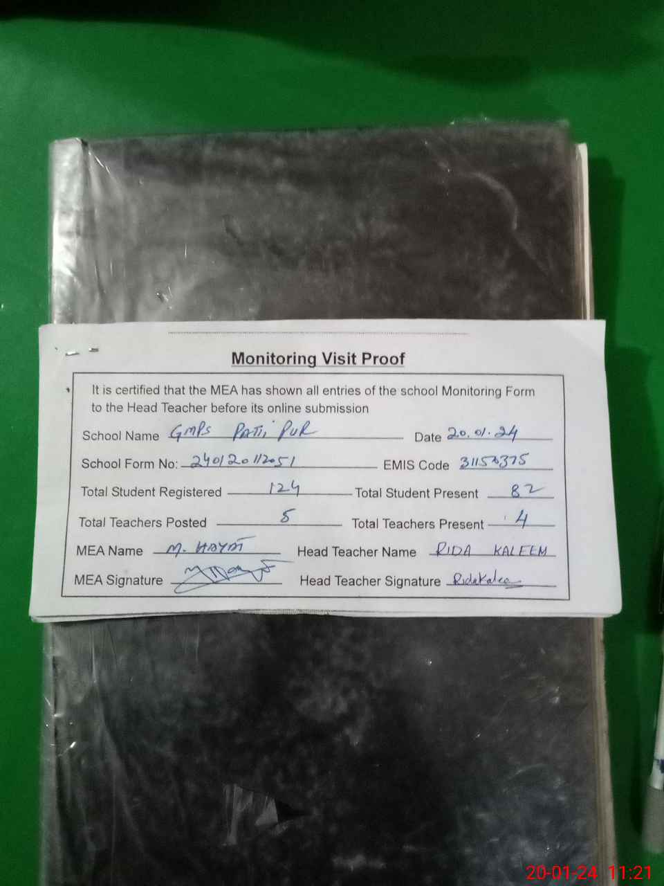 | Attendance Register | Head Teacher | MEA with School | Visit Proof |