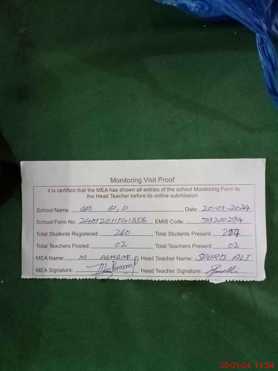 | Attendance Register | Head Teacher | MEA with School | Visit Proof |