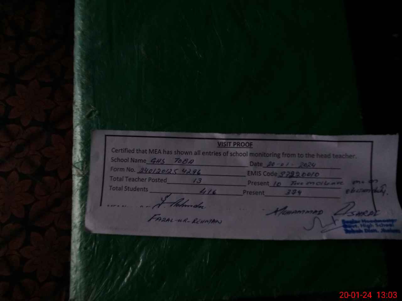 | Attendance Register | Head Teacher | MEA with School | Visit Proof |