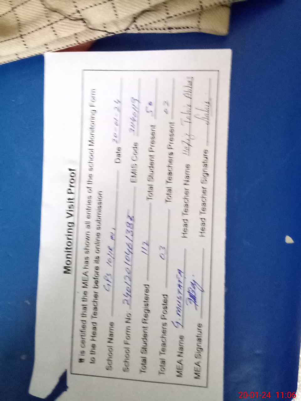 | Attendance Register | Head Teacher | MEA with School | Visit Proof |