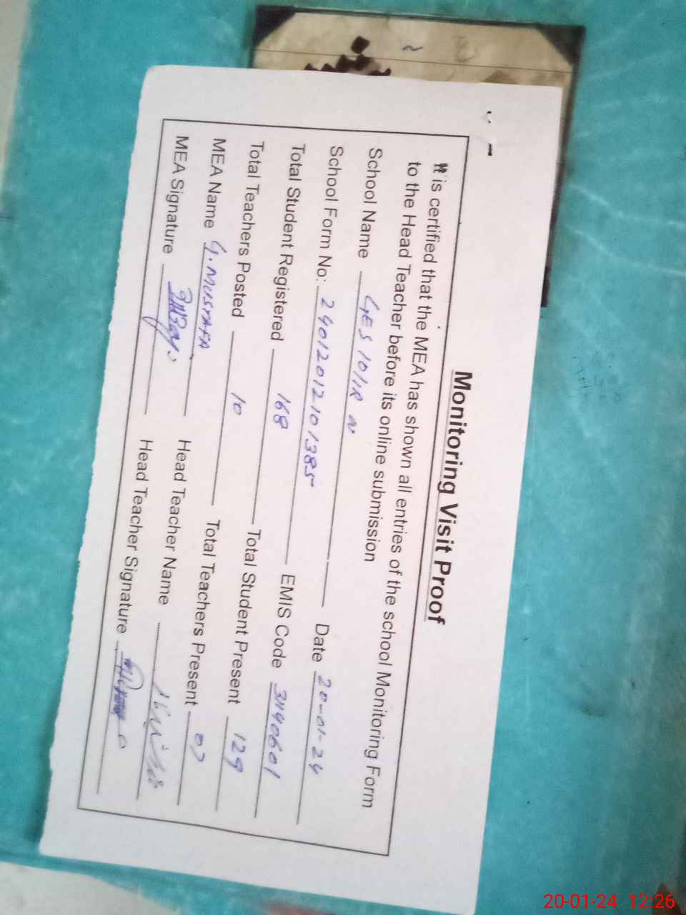 | Attendance Register | Head Teacher | MEA with School | Visit Proof |