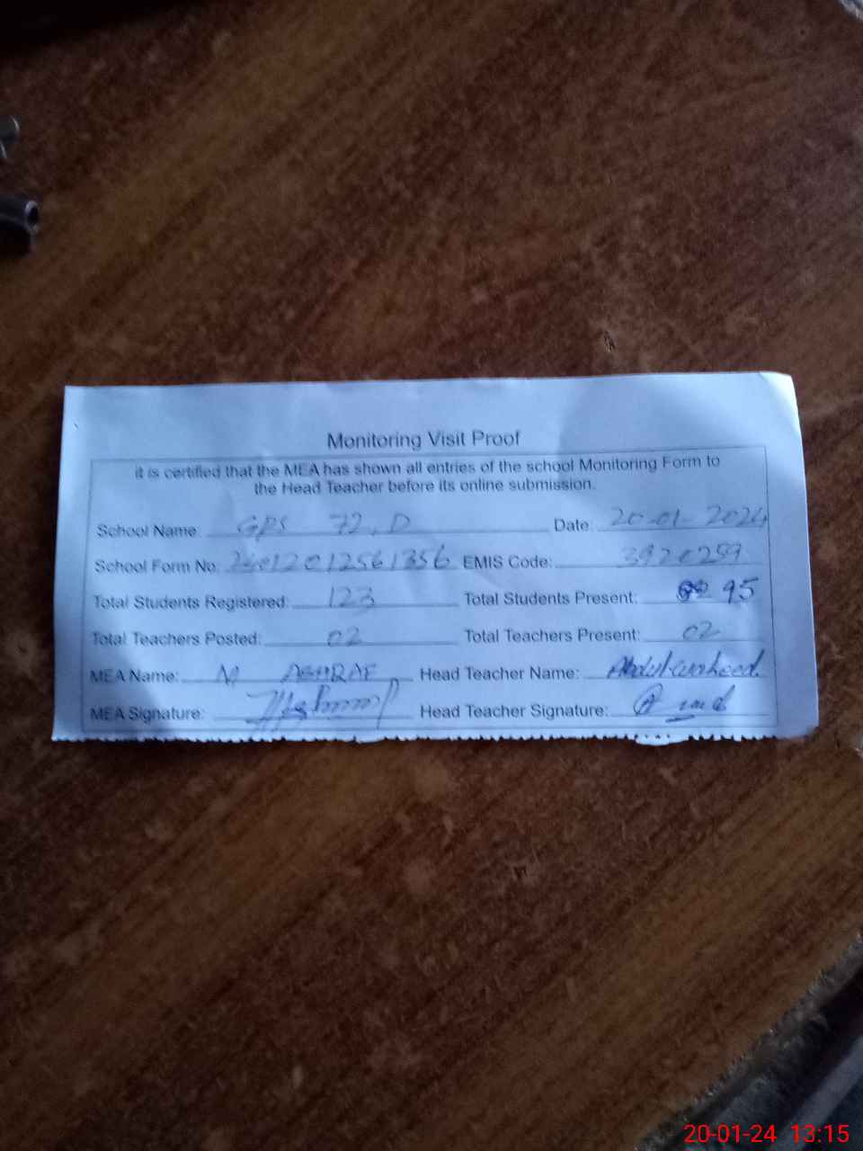| Attendance Register | Head Teacher | MEA with School | Visit Proof |