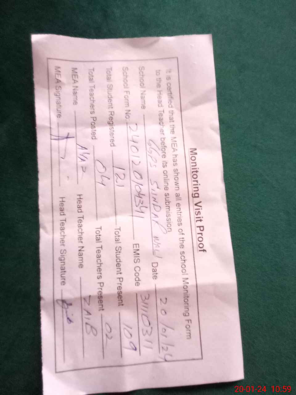 | Attendance Register | Head Teacher | MEA with School | Visit Proof |