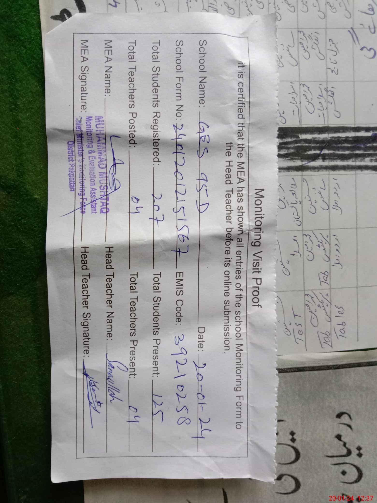 | Attendance Register | Head Teacher | MEA with School | Visit Proof |