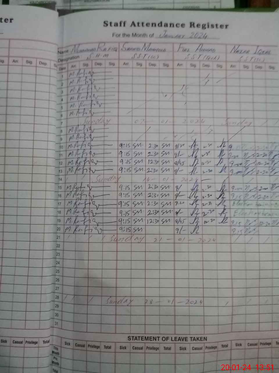 | CNIC | Full Name | Designation | R/C | Absence During Last Calender Month |