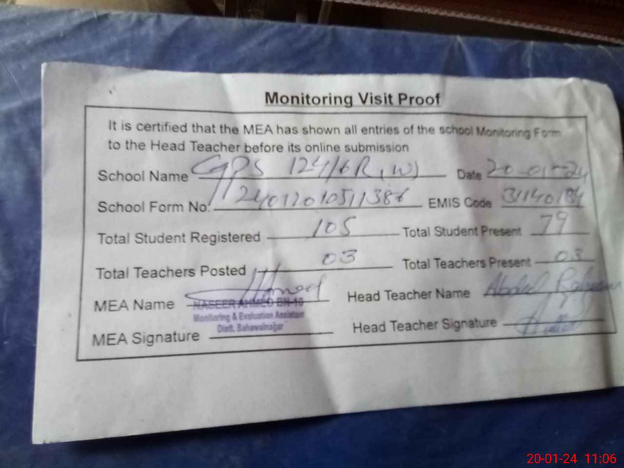 | Attendance Register | Head Teacher | MEA with School | Visit Proof |