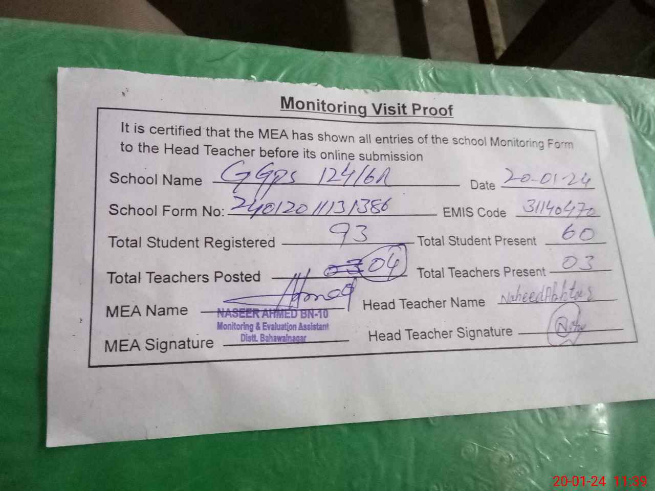 | Attendance Register | Head Teacher | MEA with School | Visit Proof |