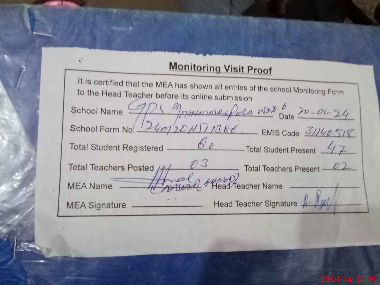 | Attendance Register | Head Teacher | MEA with School | Visit Proof |