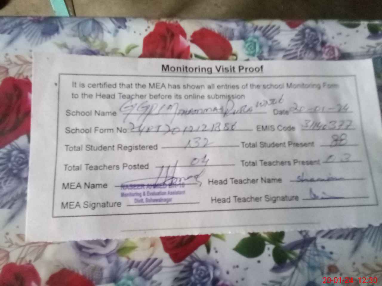 | Attendance Register | Head Teacher | MEA with School | Visit Proof |